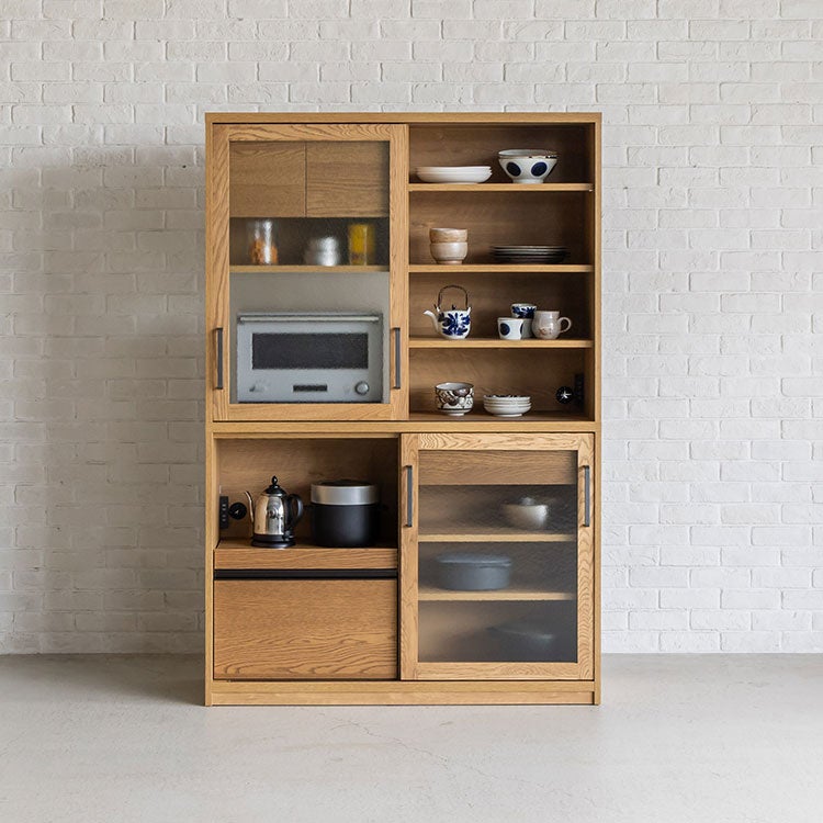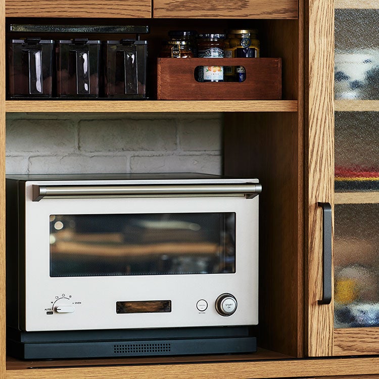 一台で完結できるため、都市部の狭小住宅や賃貸など、食器棚と家電収納ラックの両方を置くのは難しい、そんな方に使っていただきたい商品です。