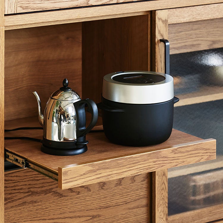 コンセント(2口)付き。棚は簡単に出し入れできるため、炊飯器や電気ケトルなど蒸気が出る家電や、上開きの家電を置くのに最適です。