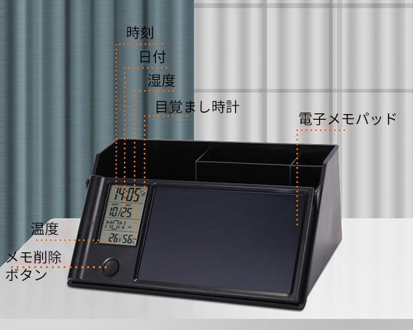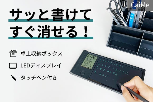 時間/日付/温度表示機能付きの電子メモパッド&卓上収納ボックス2in1「CaiMe」【充電不要・タッチペン付き・コンパクト】