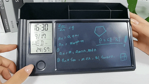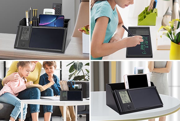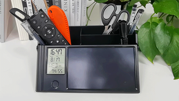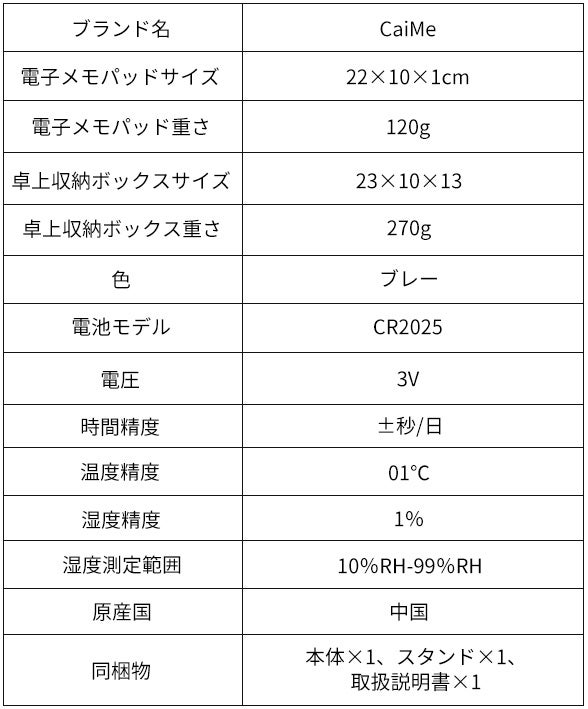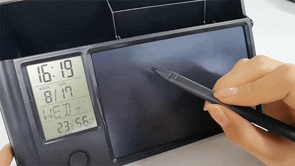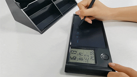 - 「CaiMe」は家庭での伝言板としての利用だけでなく、オフィスなどのビジネスシーンでの利用にも適した斬新な電子メモパッドです。また、時間/日付/温度/湿度表示もあり、デスク上でペンやブラシ、口紅などの小物を収納するストレージボックスとしても使用できます。いつでもどこでも大活躍です!