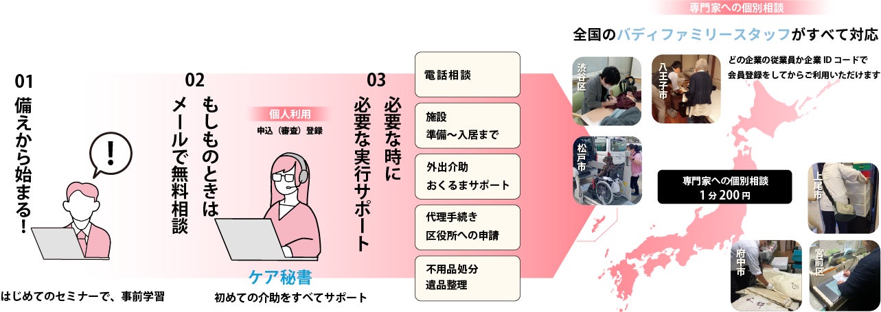 ケア秘書が入院・病院対応、介護認定手続き、ケアマネジャー選定を実施。バディファミリースタッフは自宅リフォームや生活支援を担当します。
