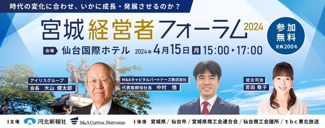主催:河北新報社、M&Aキャピタルパートナーズ株式会社 後援:宮城県、仙台市、宮城県商工会連合会、仙台商工会議所、tbc東北放送 ※一部申請中含む |
