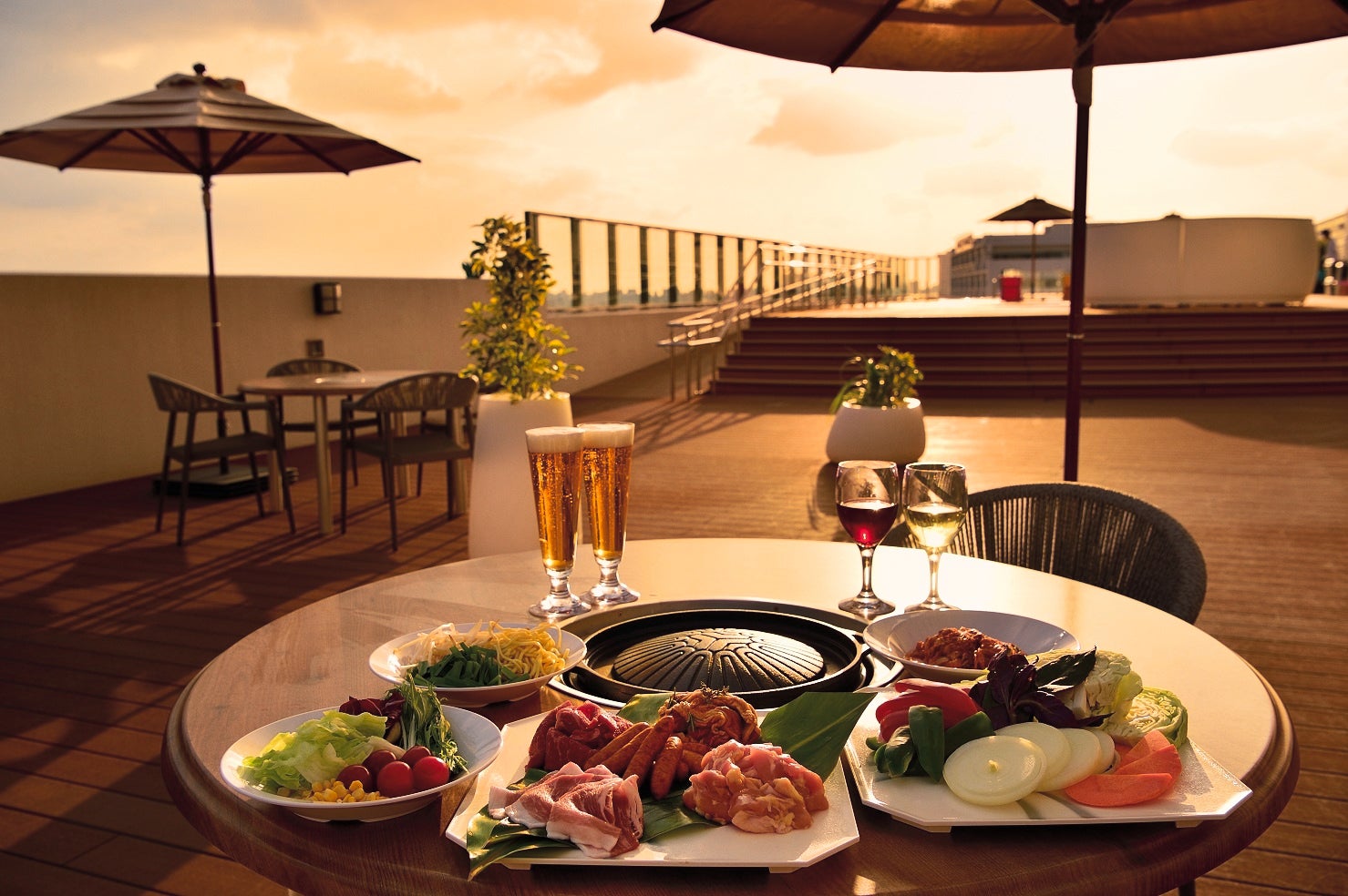 ノボテル沖縄那覇(那覇市:坂本 公敏総支配人)では、2024年4月1日(月)より夏季限定のBBQテラスがオープンとなります。那覇市内にいながらにしてリゾート気分も味わえる人気のインフィニティプールに隣接するBBQテラスは、4⽉〜10⽉の夏季限定営業。メニューは、時間内お好きなだけ召し上がれる「ゆんたくコース」と、人数分がセットになった「はいさいセット」の2種類をご用意。お⾁や海鮮類、野菜などの他、沖縄そば麺を使った沖縄ならではの焼きそばや、ランチブッフェで⼈気のホテル特製カレーのほか、ソフトドリンクが数種含まれます 。アルコールも各種ご⽤意しており、地元のオリオンビールや軽めのオリオンチューハイ「ワッタ」などアルコール類も充実。単品からフリードリンクプランもご用意しています。⼈気のオリオンビールを含むアルコールフリードリンクプランもおすすめ。オープンエアの開放的な空間で、グループやファミリーで賑やかなBBQディナーをお楽しみ下さい。