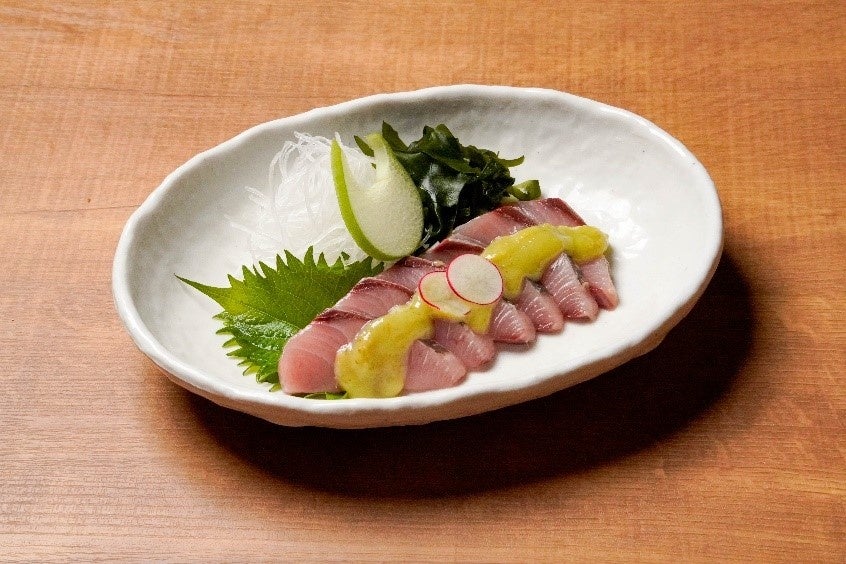 高知県の宿毛湾で丁寧に育てられた活〆鰤(ブリ)に、にんにく、味噌、酢を混ぜてつくる高知県の伝統的な調味料である「ぬた」を合わせた一品です。