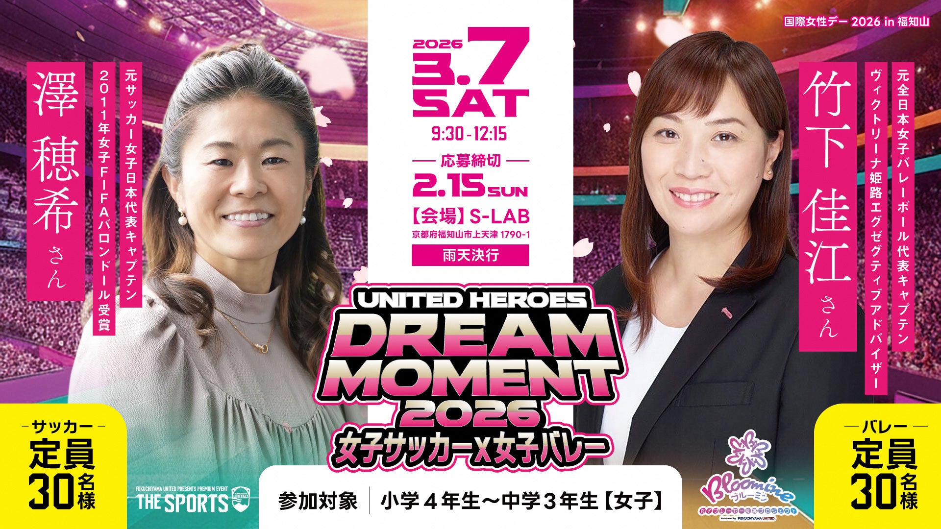 福知山市でこどもたちが多種多様なトップアスリートや競技と触れ合える機会を創出し、夢を持つきっかけづくりとなるイベントとして2023年度から開始した「THE SPORTS/UNITED HEROES」。今回は国際女性デーに合わせて、女子プレーヤーに向けてスポーツの楽しさや女子特有の問題に対する前向きな環境づくりへのメッセージとして、福知山ユナイテッドが進める–Bloomine(女子プレーヤー応援プロジェクト)– の取り組みの一環として開催します。