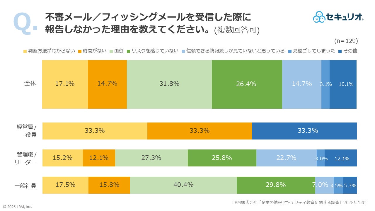不審メールを報告しない理由は、全体で「面倒(31.8%)」が最多、次点が「リスクを感じていない(26.4%)」ですが、職位別では課題が異なります。