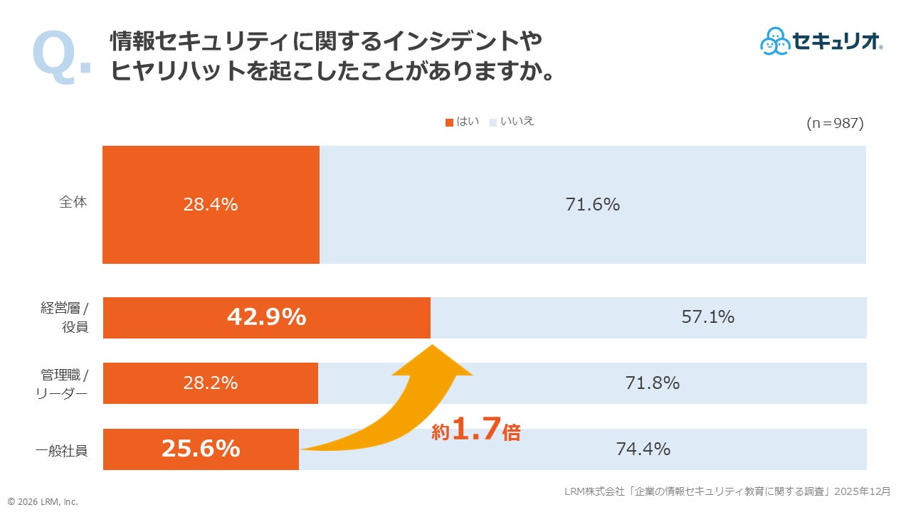 経営層のセキュリティインシデント/ヒヤリハット経験率は42.9%に達し、一般社員(25.6%)の約1.7倍に。