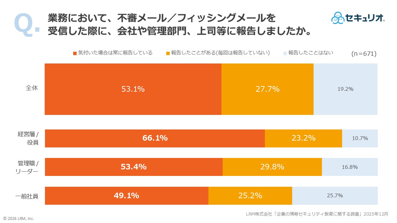 不審メールを受信した経験がある層(全体の68.0%)に対し、その後の対応を調査したところ、「常に報告している」と回答した人は全体で53.1%に留まりました。