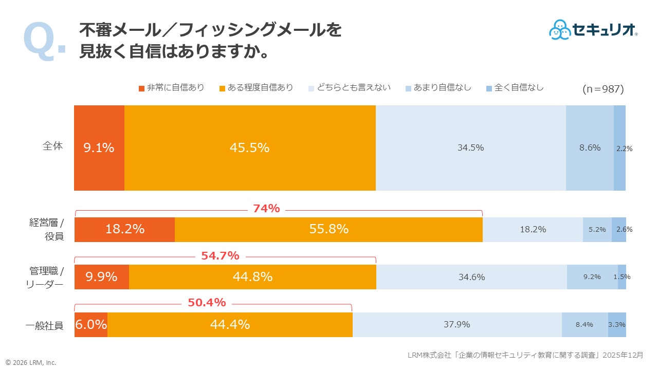 また、経営層の不審メールを見抜く自信についても74.0%(非常に自信あり+ある程度自信あり)と、管理職(54.7%)や一般社員(50.4%)と比較して突出した数値を示しました。