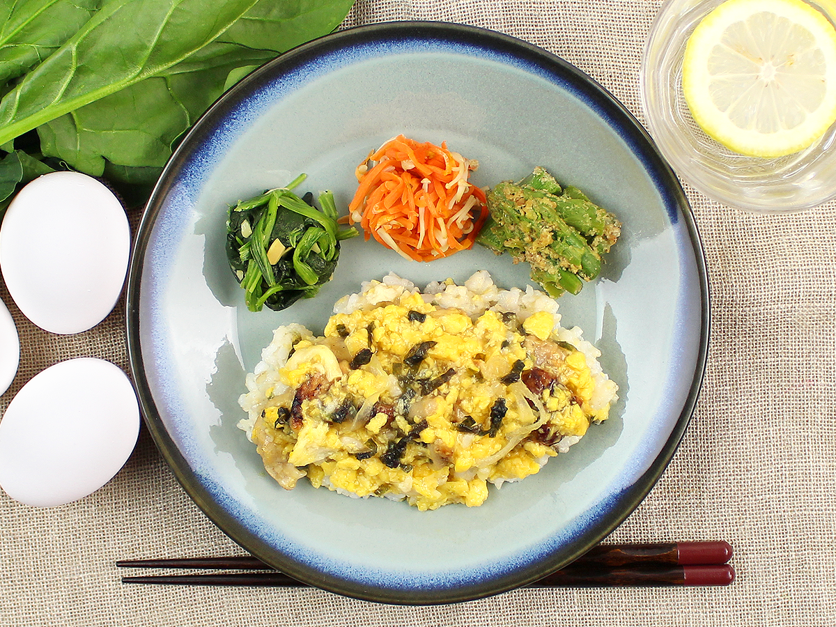 副菜は、スライスしたアーモンド入りのほうれん草のおひたし、えのきの生姜醤油、アスパラのごまあえです。