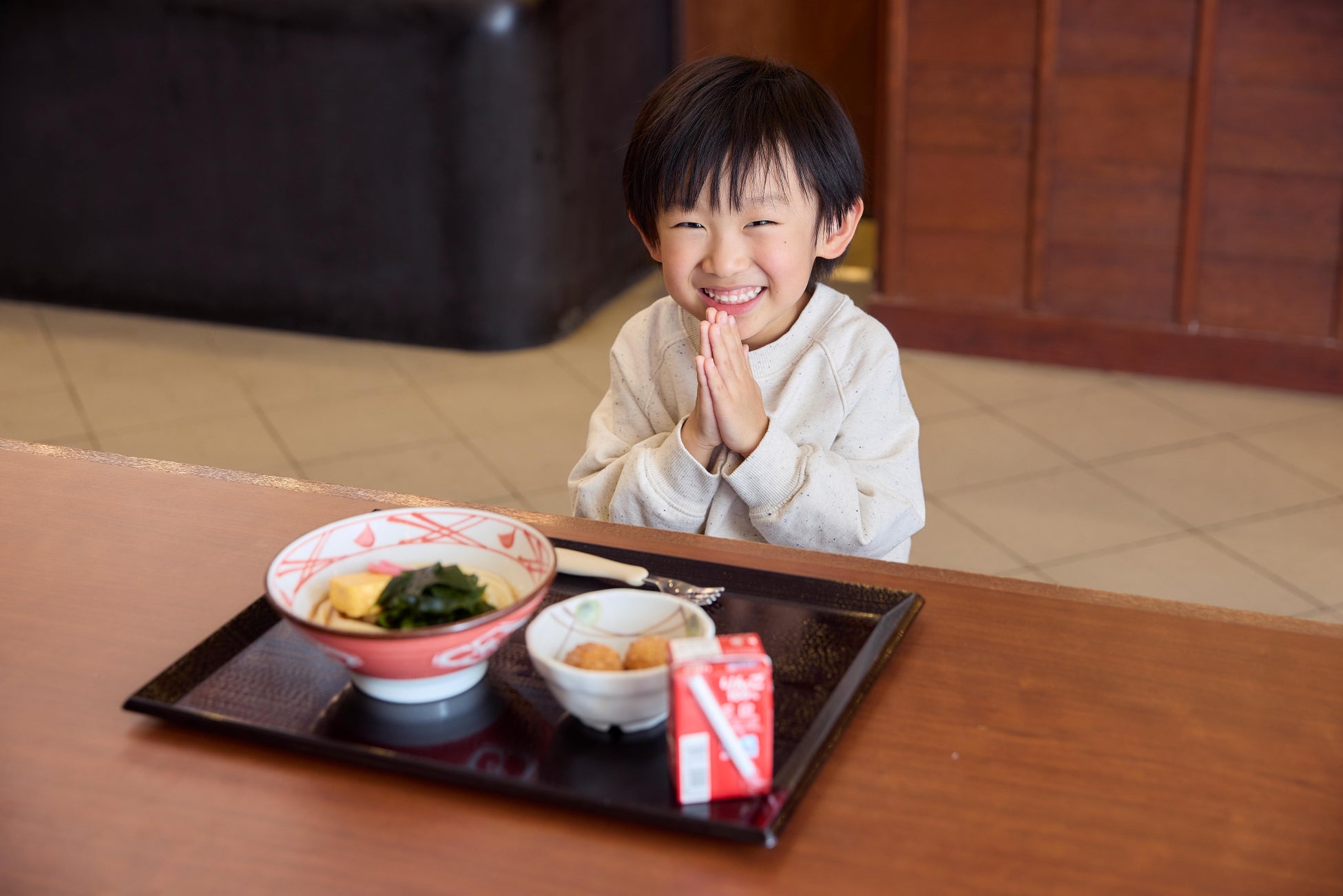 2021年、『丸亀こどもうどん弁当』を開発し販売。お子さまが笑顔になれる食事、そして幸せそうに食事をするお子さまの姿を見て、周りの方々も自然と笑顔になれる、そんな“笑顔の連鎖”を生み出すきっかけを作りたいという想いは反響を生み、多くのお客さまにご好評をいただきました。