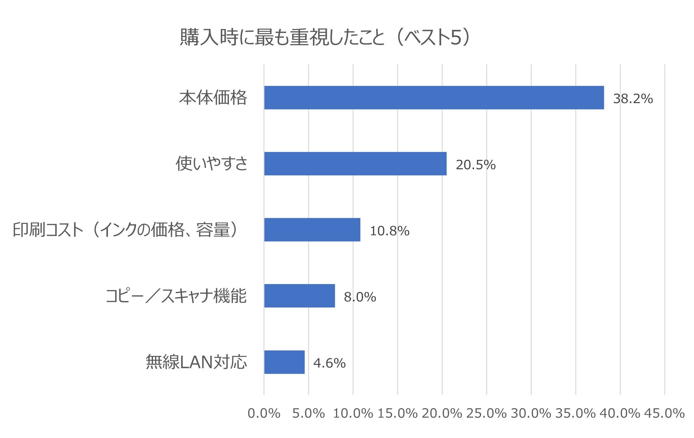購入した理由の1位は、「年賀状印刷」、2位「書類の印刷」、3位「書類のコピー」、4位「前に使っていたものが壊れた」、5位「写真プリント」となりました(複数回答)。 実際の用途もほぼ同じで、1位は「年賀状印刷」、2位は「書類の印刷」「書類のコピー」(同率)、4位「Webページの出力」、5位「写真プリント」となりました(複数回答)。家庭用プリンターの購入時に最も重視したポイントは、「本体価格」が38.2%と最も多く、次いで「使いやすさ」「印刷コスト(インクの価格、容量)」「コピー/スキャナ機能」「無線LAN対応」という結果になりました。