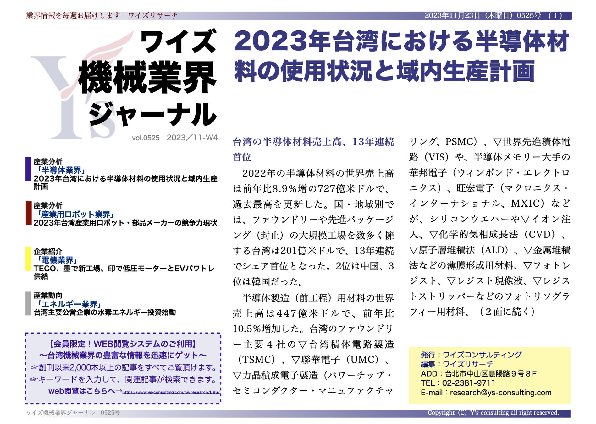 【台湾情報】2023年半導体材料の使用状況と域内生産計画 <ワイズ機械業界ジャーナル2023年11月第4週号発行>
