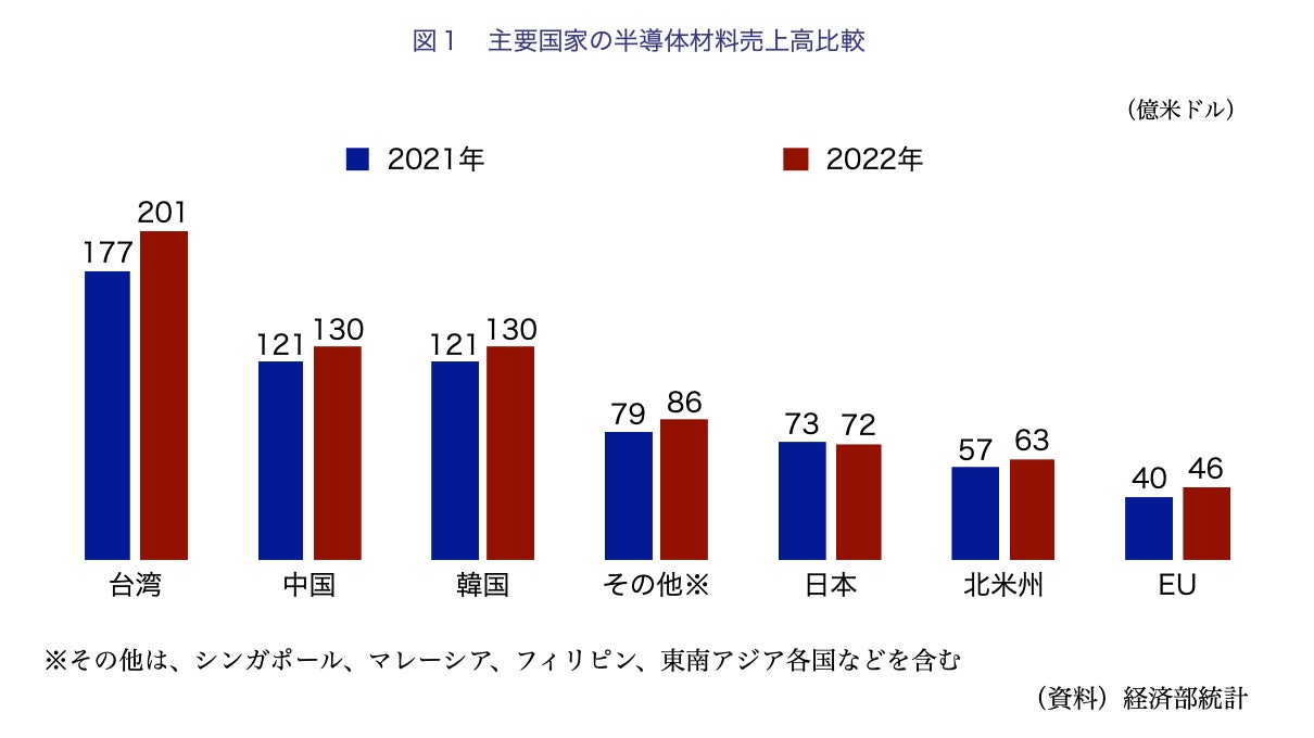 2022年の半導体材料の世界売上高は前年比8.9%増の727億米ドルで、過去最高を更新した。国・地域別では、ファウンドリーや先進パッケージング(封止)の大規模工場を数多く擁する台湾は201億米ドルで、13年連続でシェア首位となった。2位は中国、3位は韓国だった。