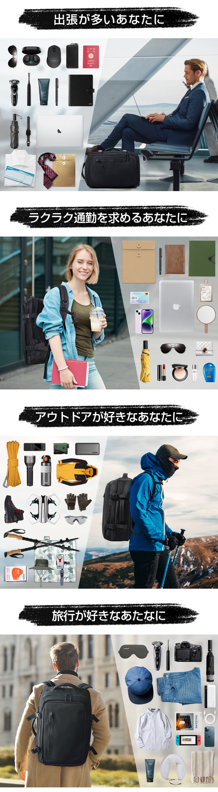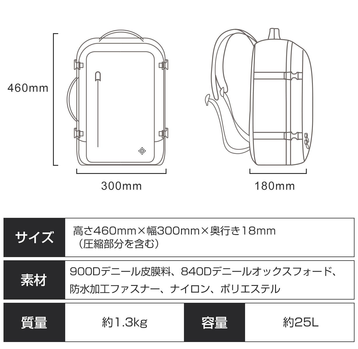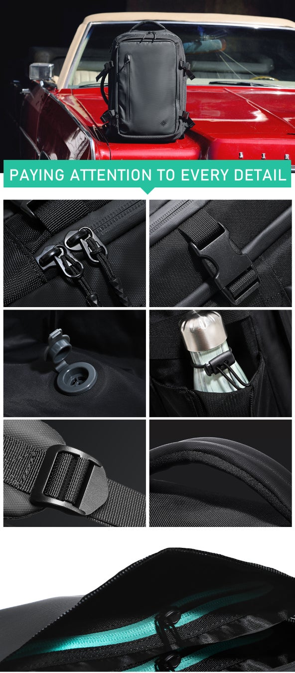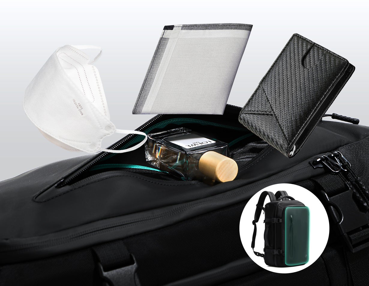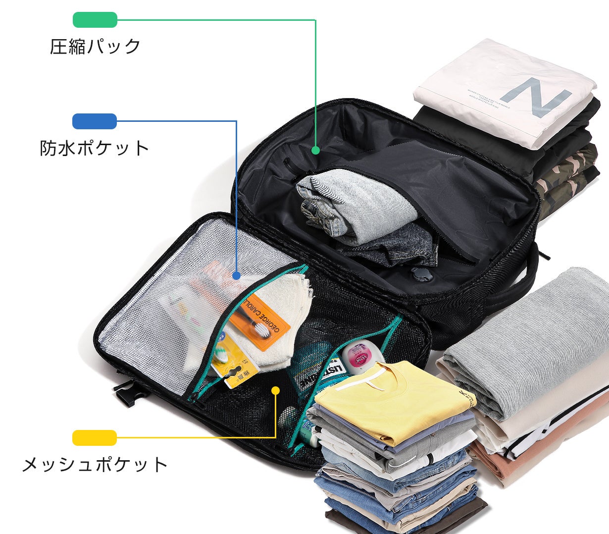 圧縮パック、防水ポケット、メッシュポケットの3大ポケットにより出張やアウトドアの際に必要なものをたっぷり収納できます。