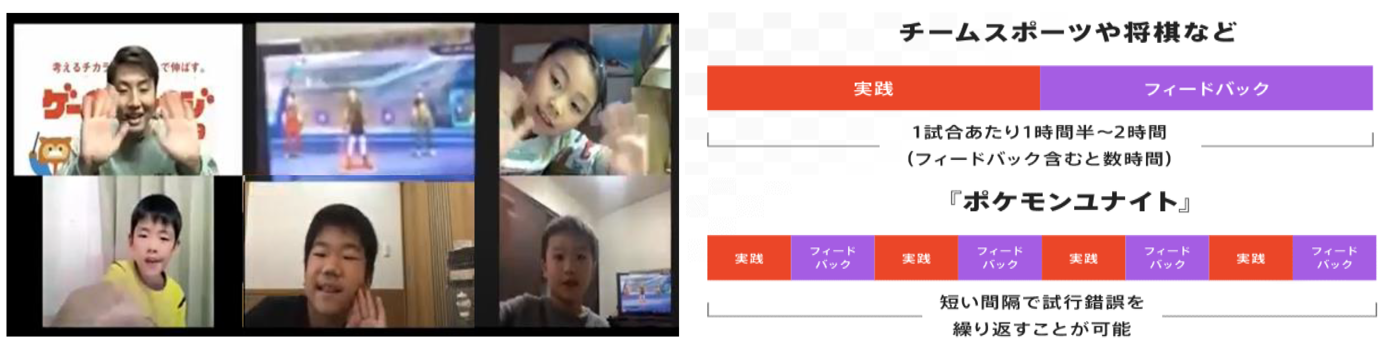 『ポケモンユナイト』ではおよそ10分前後で試合が完結し、どこが良かったか・どこを直すべきかの課題分析とその練習といったPDCAを早く回すことが可能です。野球やサッカー等のチームスポーツや将棋や囲碁などのボードゲームでは1試合あたり1時間半〜と長めであり、また課題の洗い出しにどうしても時間がかかってしまう傾向にありますが、実践とフィードバックを高速で繰り返すことで、論理的思考・課題認識力・探究心・コミュニケーション力等の定着を図ります。