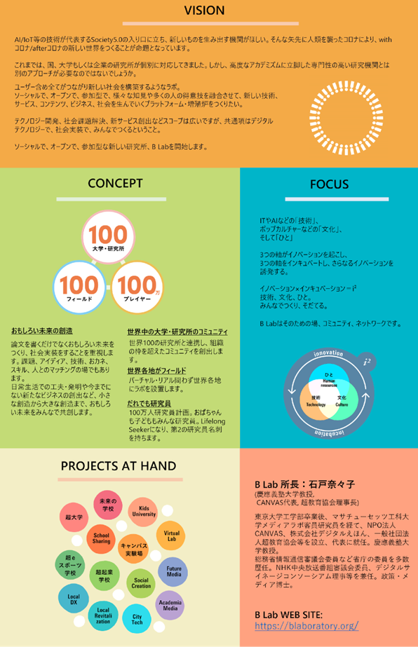 Beyond, Borderless, Breakthroughの頭文字をとった「B Lab」は、研究所と銘打ちながら、世界中の大学・研究所、地域、人材をつなぎ、多くの人の得意技や知見を融合させ、新しい技術、サービス、コンテンツ、ビジネス、社会を生みだす参加型プラットフォームです。テクノロジー開発、社会課題解決、新サービス創出などスコープは広いですが、共通項は社会実装で、みんなでつくるということ。お父さんもお母さんもおばちゃんも子どももみんな研究員。Lifelong Seekerになり、第2の研究員名刺を持ちます。ソーシャルで、オープンで、参加型で、ユーザーふくめ全ての人がつながり新しい社会を構築し、課題、アイディア、技術、おカネ、スキル、人をマッチングさせ、小さな創造から大きな創造までおもしろい未来をみんなでつくることを目指します。