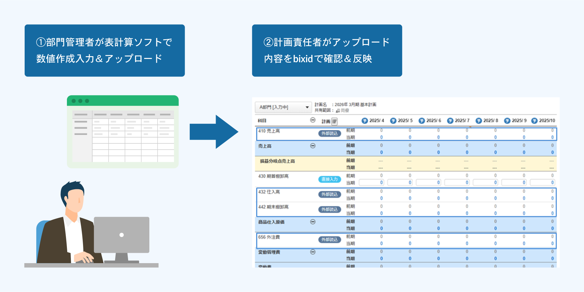 経営計画では、売上高などの計画数値は各部門で管理している資料の複雑な計算式を利用して設計されます。この数値をベースとなった表計算ソフトから、各部門担当者がbixidに直接アップロード可能です。アップロードされた数値を計画管理者が確認・反映することで、直接部門の専門的な数値は部門担当者が、間接部門の管理費などは計画管理者が設計するという運用体制が構築できます。日々のKPIについても表計算ソフトから担当者が直接アップロードし、責任者はbixidで統一管理が可能になります。