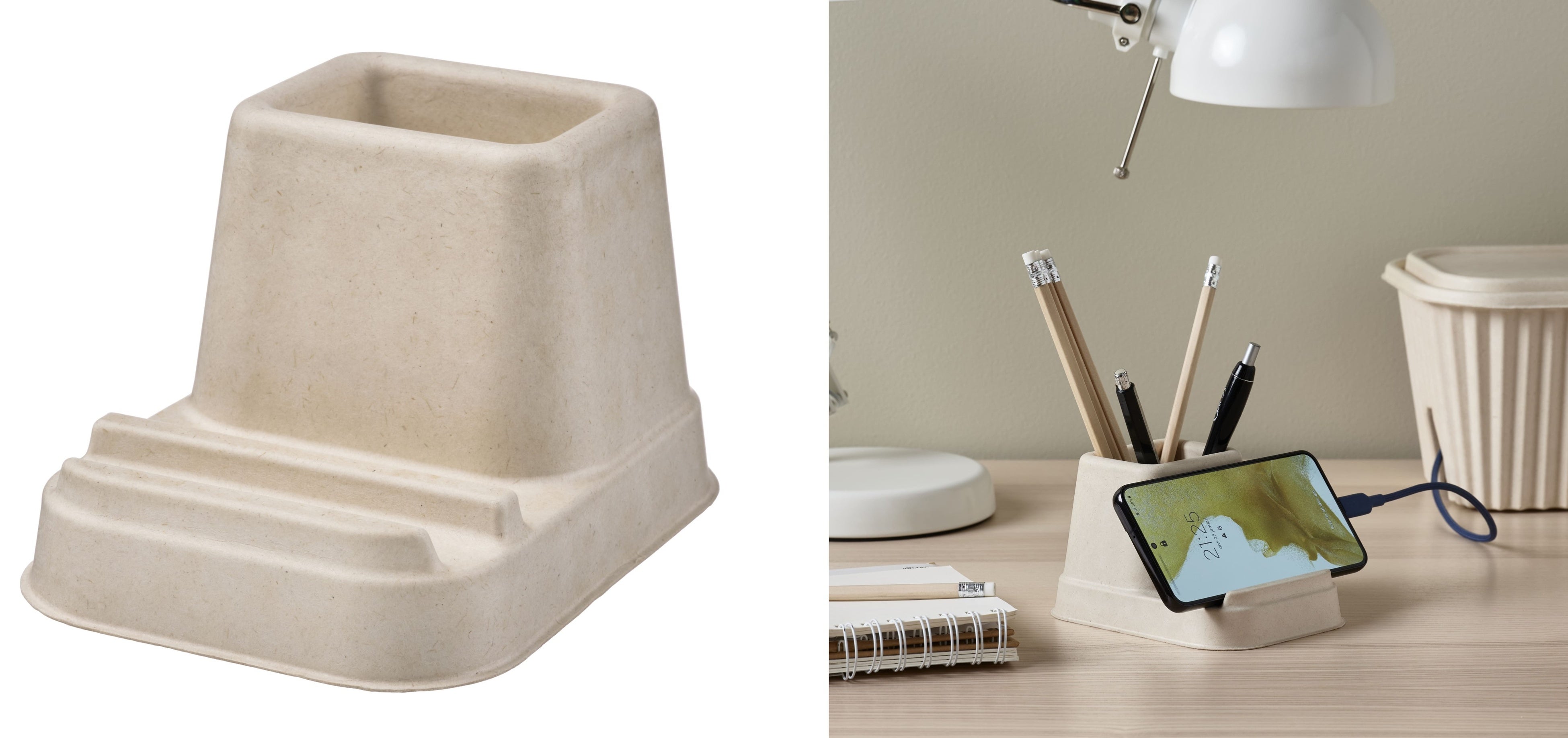 携帯電話とペンの両方を収納できる小さなホルダー。限られたスペースを有効に活用できるので、デスクやベッドサイドテーブルでの使用にぴったり。 携帯電話を立てかける溝が2つあるので、角度を簡単に調節できます。充電したいときは、横向きに置けばそのまま充電できます。無漂泊のペーパーボード製で軽量です。