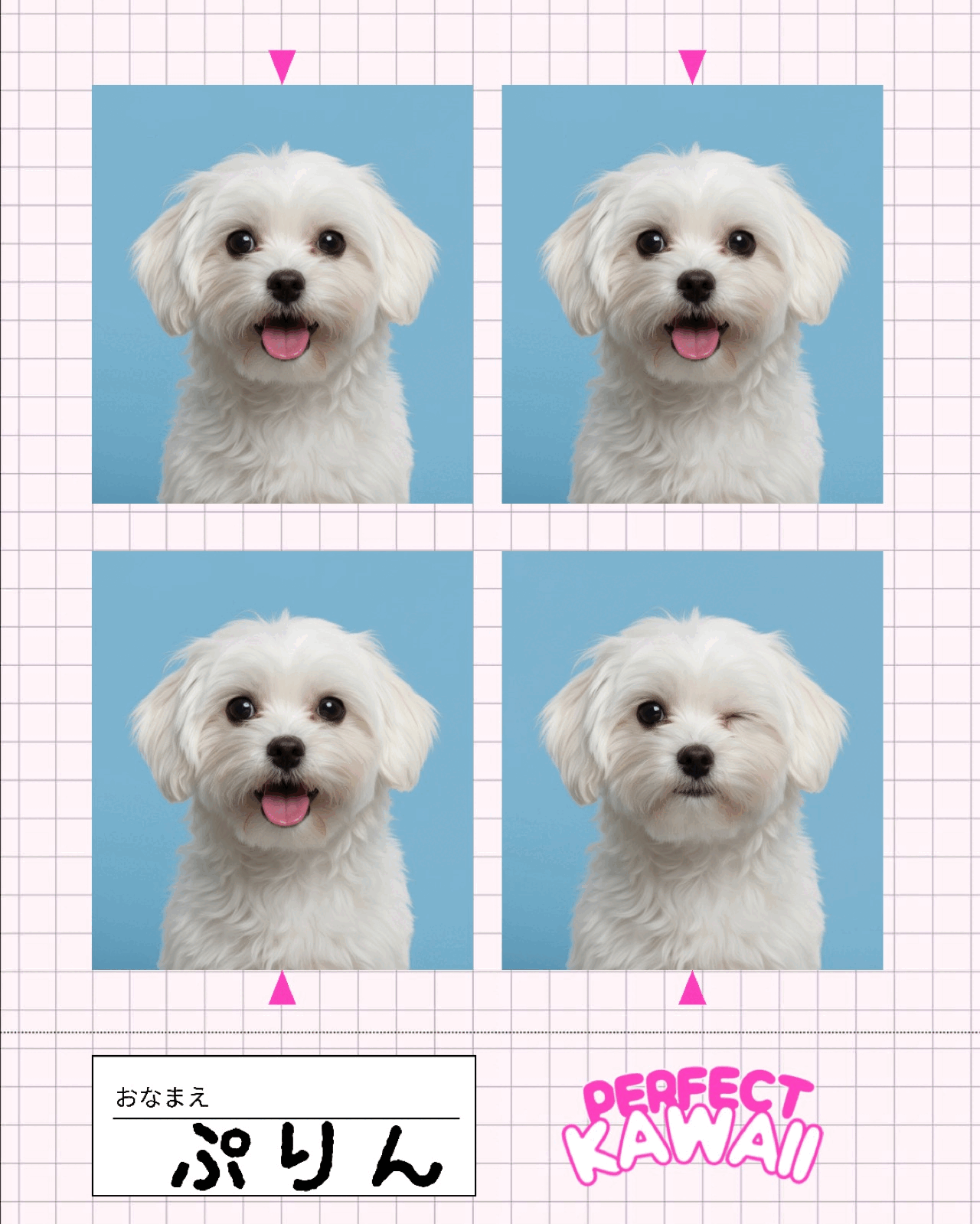 写真を1枚アップロードするだけで、AIが背景を切り抜き、正面を向いた「キメ顔」に自動補正。愛嬌たっぷりで可愛いながら、どこか真面目な証明写真を一瞬で生成します。