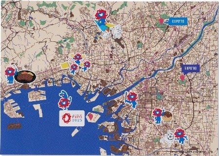 会場の上空から大阪の街を俯瞰したビューマップのデザインと、モノクロの地図で会場を強調したデザインです。ビューマップ(俯瞰図)は、万博会場と大阪の主要観光スポット、主要駅がどのような位置関係にあるかなど街全体が把握できます。また、万博公式キャラクター「ミャクミャク」が様々なポーズであしらわれた可愛いデザインで、ビューマップ(俯瞰図)には英語も併記されているため、海外の方にも喜んでいただける商品になっています。