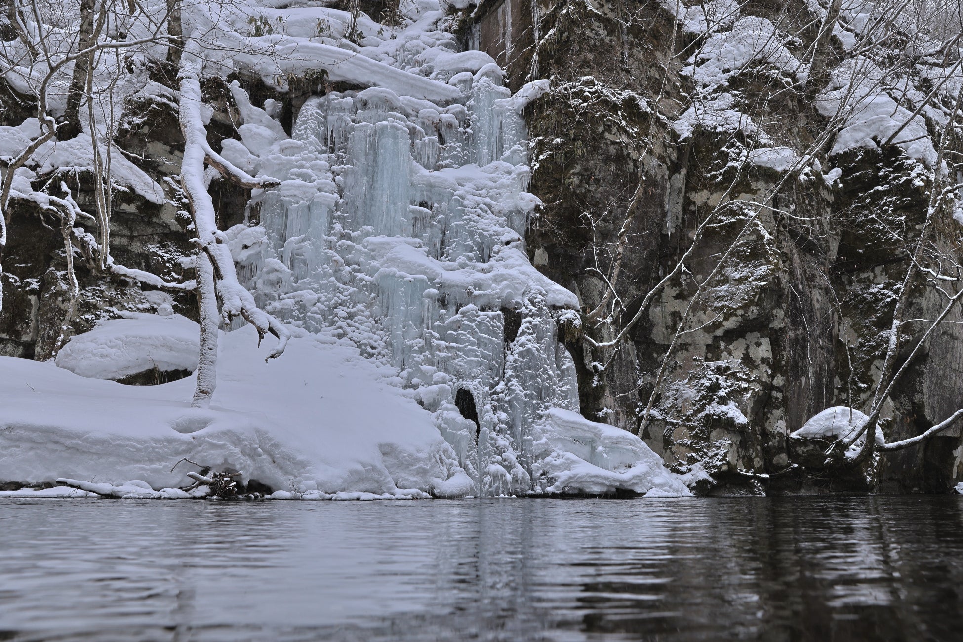 青みを帯びた氷柱が並ぶ渓谷は、冬の奥入瀬ならではの美しさを放ちます。