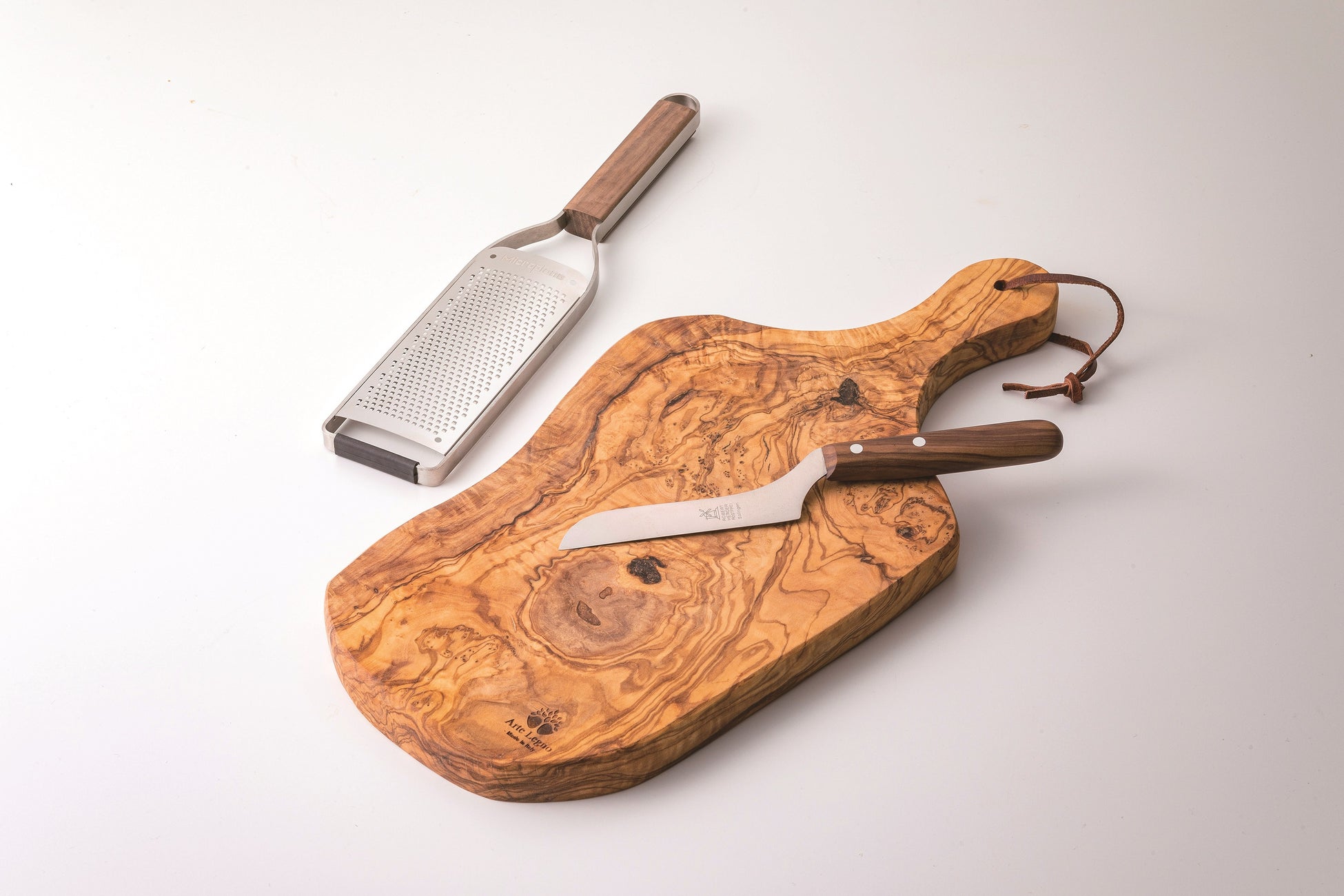 オリーブの木目・樹形を活かしたカッティングボード、ドイツ老舗ブランドのチーズナイフ、マイクロプレイン社製のゼスター最上級モデルなど、こだわりのキッチンアイテムをご紹介。※ ゼスター6,050円・オリーブカッティングボード8,800円・チーズナイフ9,900円