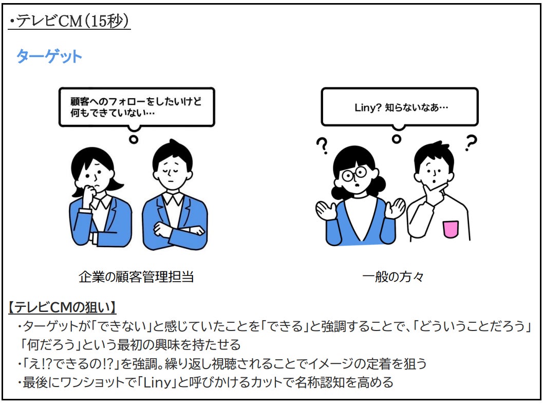 株式会社CARTA HOLDINGSのグループ会社で、運用型テレビCMを軸とした統合型マーケテイング・コミュニケーション・サービスを提供する株式会社テレシー(東京都港区、代表取締役CEO:土井 健)は、ソーシャルデータバンク株式会社が運営する、LINE公式アカウントの機能拡張ツール「Liny」の初となるテレビCM、加えてタクシーCMの制作・放映を担当させていただきました。