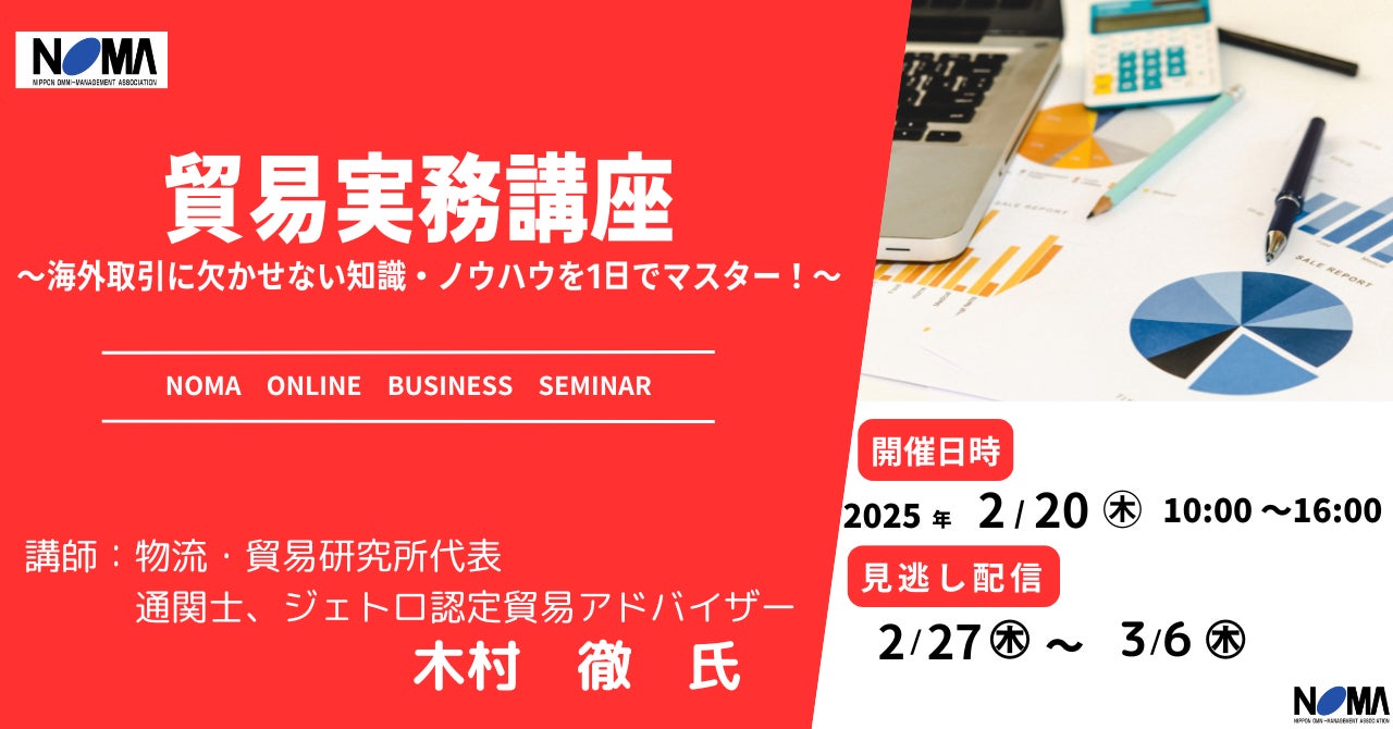 一般社団法人日本経営協会(本部事務局:東京都渋谷区、会長:高原 豪久)は、経営実務講座「貿易実務講座~海外取引に欠かせない知識・ノウハウを1日でマスター!~」を新規開催いたします。