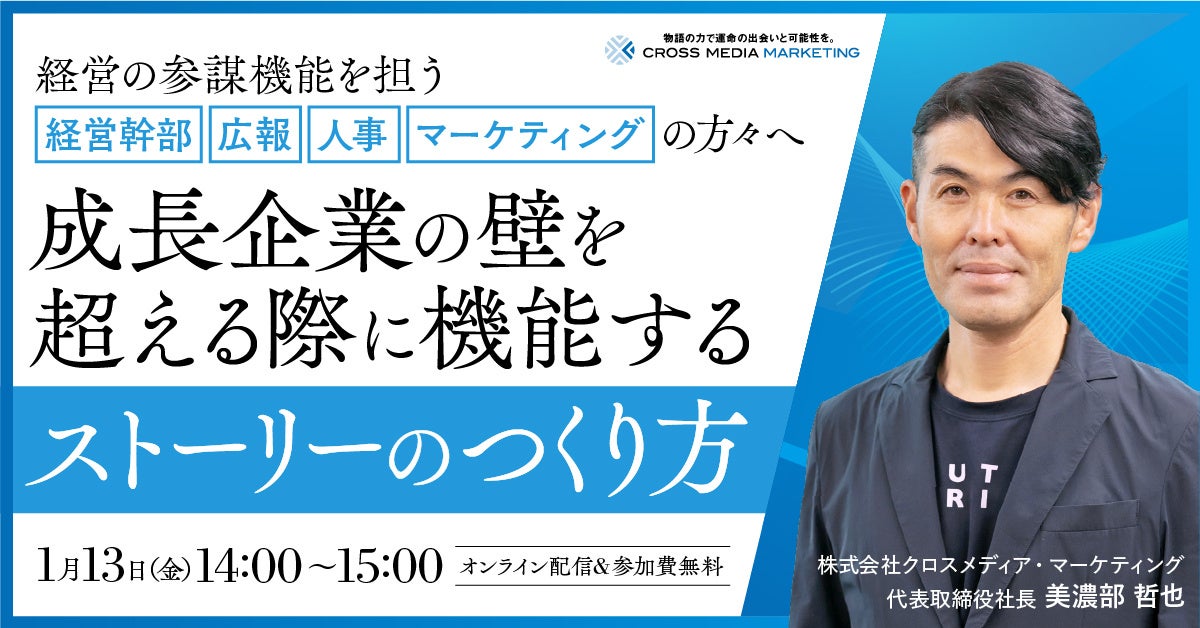 株式会社クロスメディア・マーケティングは、2023年1月13日(金)14時より「成長企業の壁を超える際に機能するストーリーのつくり方」を実施いたします。