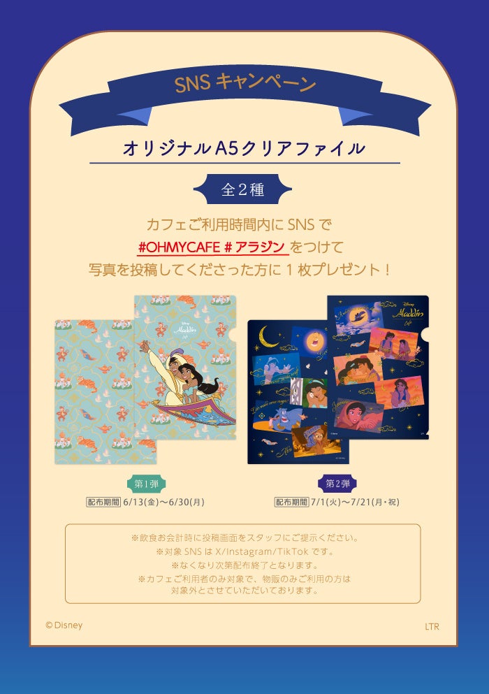 ■SNSキャンペーン:XまたはInstagramまたはTikTokでカフェ店内もしくは飲食メニュー写真に「#OHMYCAFE」、「#アラジン」をつけて投稿していただいた方に先着で
