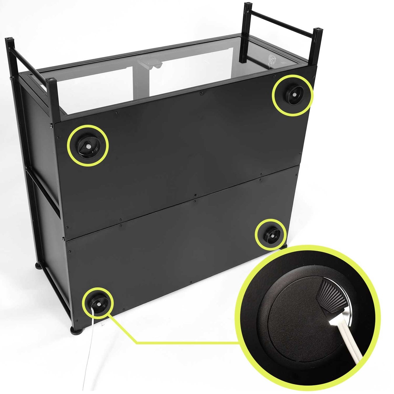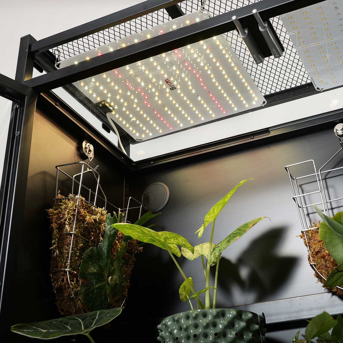 本製品は、観音開きの扉に加え、天板部分にもガラス戸を採用。内部に置いた植物の様子がよく見えることはもちろん、キャビネット外部に設置した育成ライトの光を上から当てることも可能です。高湿度になる温室内部に設置するのと比べ故障リスクを低減できるので、高価な育成ライトを扱う際も安心。パネルライトの取り付けに便利なメッシュ棚板も1枚付属し、DIY不要で誰でも簡単に最適な育成環境を整えることができます。また、背面には4つの通気孔(換気口)を配備。配線通しとしても活用でき、キャビネット内部に設置した電化製品※を壁のコンセントから給電しやすい仕様です。