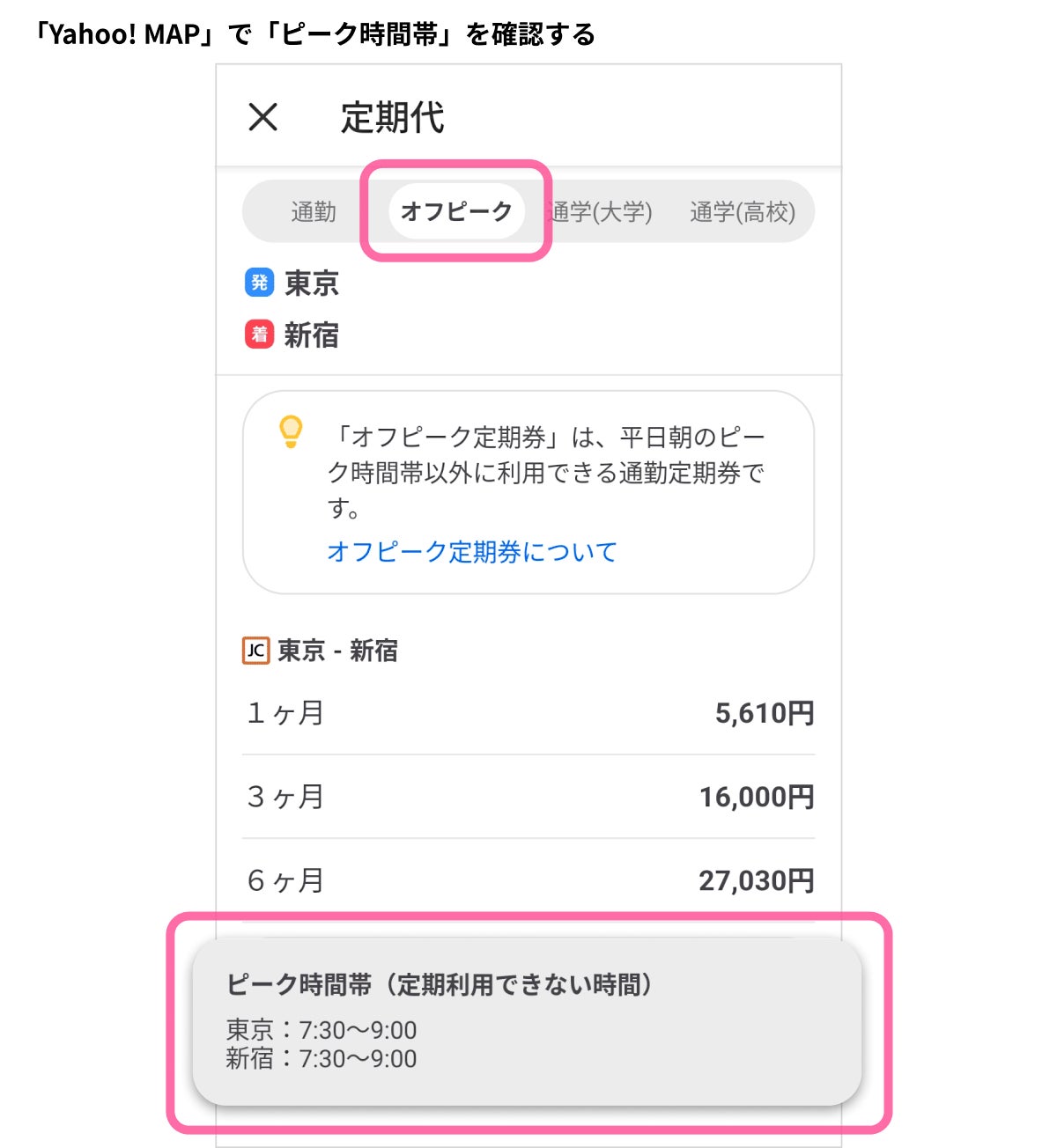 ・「定期代」タブをオフピークに切り替えることで、該当する駅のピーク時間帯(※8)も確認できます(※9)。