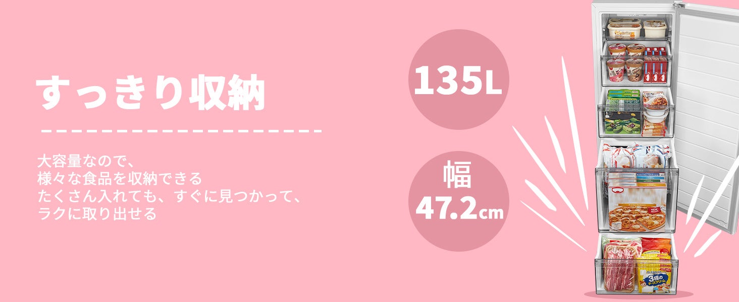 冷蔵室と冷凍室がしっかり分かれているから、使いやすさも抜群。静かで省エネ、毎日の暮らしにちょうどいい頼れる存在。今だけのお得なこのタイミングをお見逃しなく!
