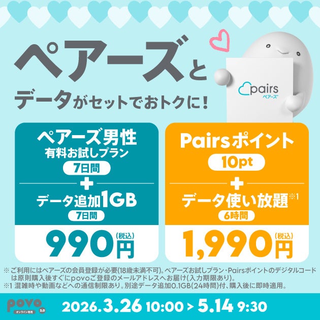 KDDI、沖縄セルラーは2026年3月26日からpovo2.0の「コラボトッピング」として、恋活・婚活マッチングアプリPairs(ペアーズ)の「男性有料お試しプラン(7日間)」と「1GB(7日間)」がセットになったトッピングを990円、「Pairsポイント10pt」と「データ使い放題(6時間)」(注)がセットになったトッピングを1,990円で提供します。