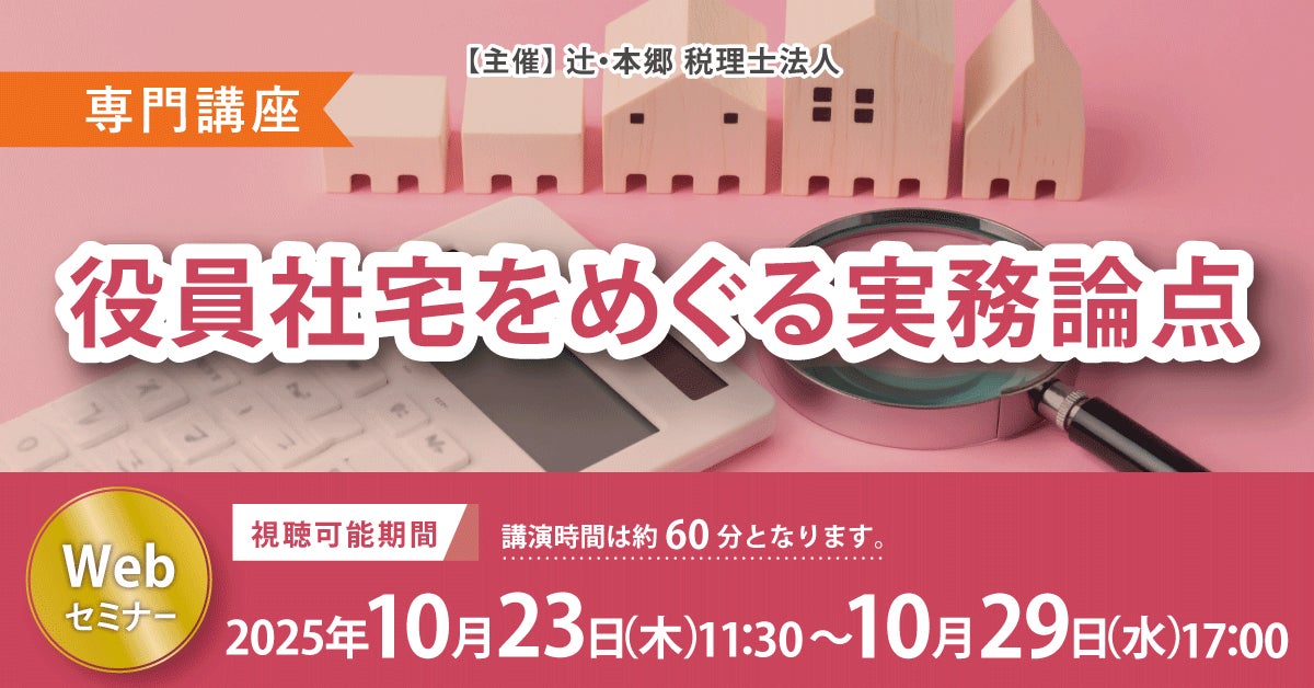 辻・本郷 税理士法人(本社:東京都新宿区、理事長:桑木小恵子)は、2025年10月23日(木)より「【専門講座】役員社宅をめぐる実務論点」セミナーを開催いたします。