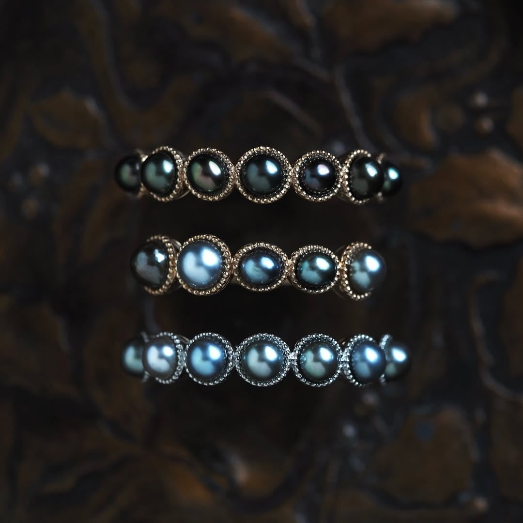 一珠一珠に自然の美しさが映り込む、ガンビエ産黒蝶真珠を贅沢にあしらった「Mille Chainon Perle(ミルシェノン ペルル)」。グレーやブルーのニュアンスを含み、自然が生み出した神秘的な色彩をご覧ください。
