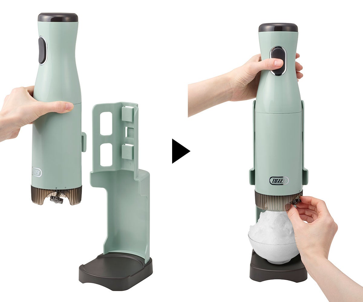 この度、おうちで"かき氷屋さん気分"を味わえる好評の電動かき氷器シリーズから、充電式のコードレスタイプ「Toffy コードレスふわふわかき氷器」が新登場。専用スタンドにセットして卓上でも使えるほか、はずして手にもってハンディタイプとしても使える2WAY仕様の電動かき氷器です。充電式のコードレスタイプのため、コードの取り回しも必要なく、場所を選ばずに氷を削れます。専用スタンドは器の高さに応じて選べる2段階設計で、背の高いグラスにも対応します。