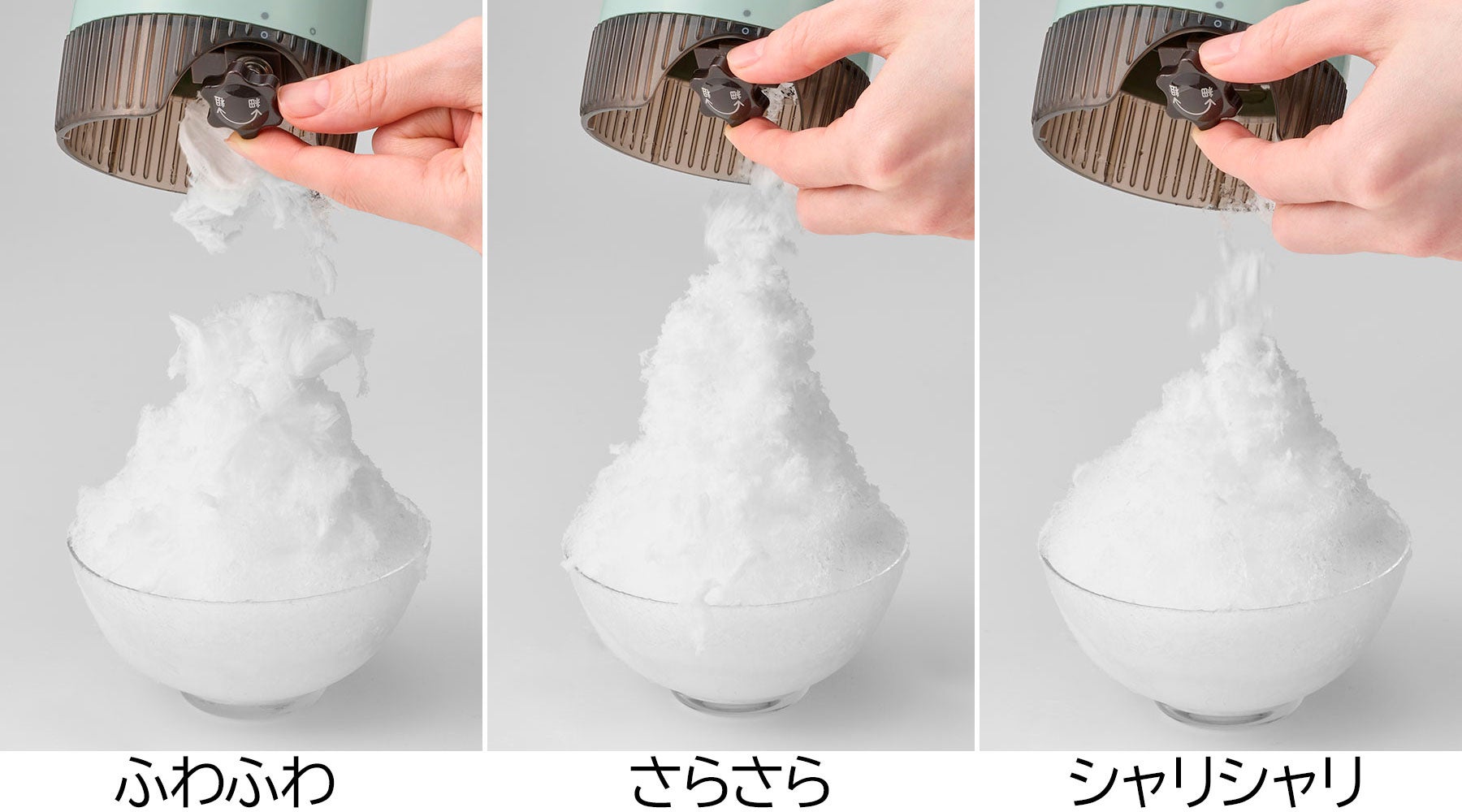 付属の製氷カップで作った氷の細かさは、刃の調節ダイヤルで氷の細かさを無段階に調節可能。ふんわり口どけなめらかなかき氷から、定番のさらさら、シャリシャリとしたかき氷まで、お好みの食感のかき氷を作ることができます。