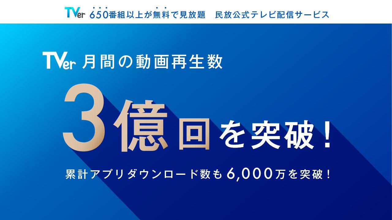 民放公式テレビ配信サービス「TVer(ティーバー)」は、2023年3月に月間動画再生数が初めて3億回(※1)を突破し、ユーザー数においても2,739万MUB(※2)の最高記録を更新。さらに、2023年4月にスマートフォン・タブレットアプリ、コネクテッドTVを合わせた累計のアプリダウンロード数が6,000万を突破したことをお知らせいたします。