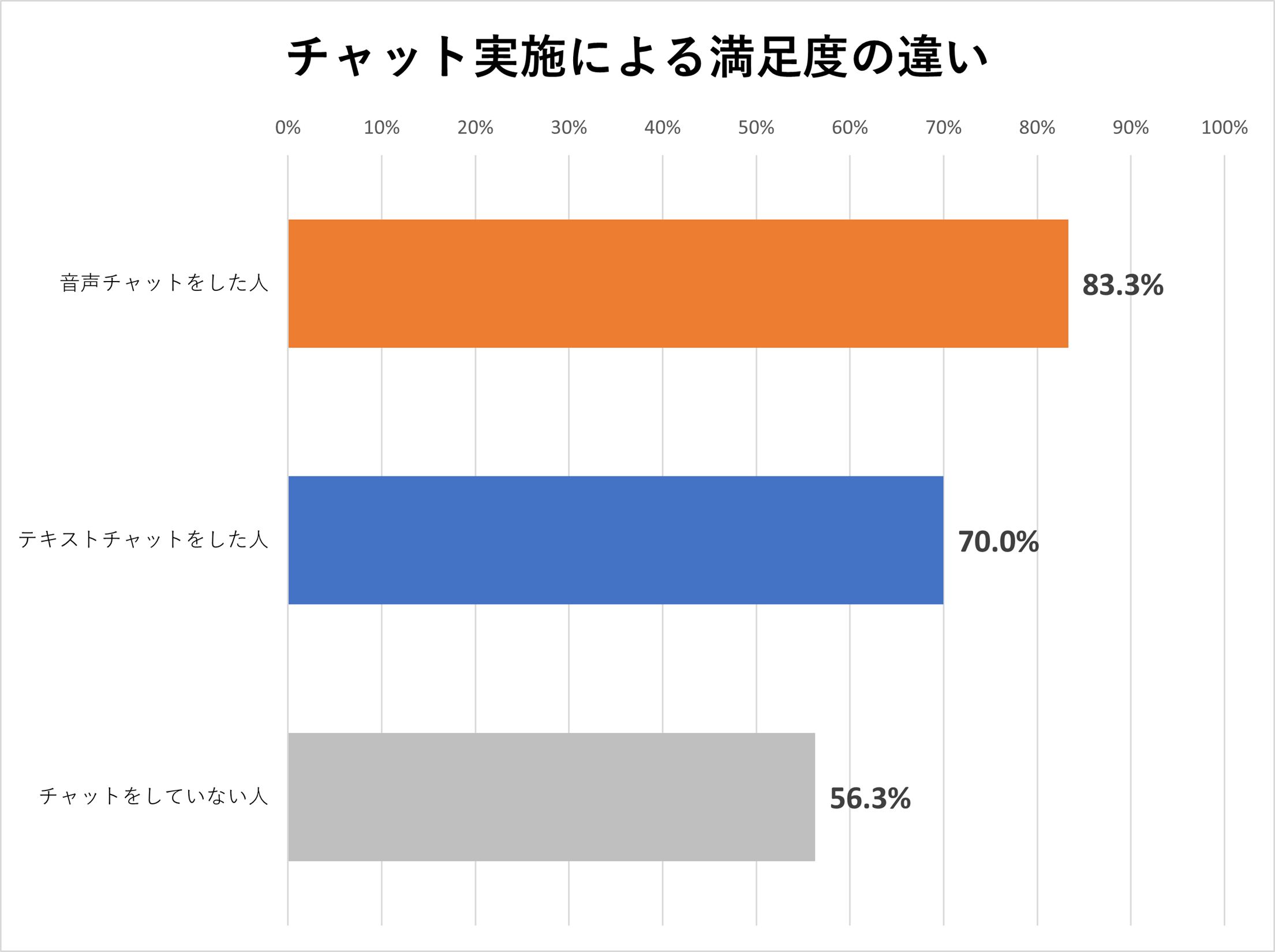 また、オンラインイベントの課題としてよく挙がるのが、参加者との双方向のコミュニケーションです。参加者と出展社でコミュニケーションを取る際に用いられるチャットの満足度についての設問では、チャットを利用していない人の満足度が56.3%なのに対して、テキストチャットを利用した人は70.0%、音声チャットを利用した人は83.3%と、チャットを利用した人のほうが満足度が高いことがわかりました。