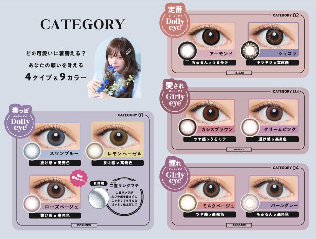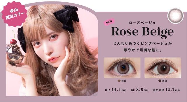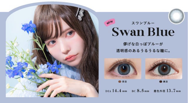 可愛らしいガーリーな印象になれる元祖「バンビシリーズワンデー」から、ほんわりちゅるとしながらも“毒っぽドーリー”な雰囲気になれる新色3色が登場。白っぽいブルーが瞳の透明感を引き出す「スワンブルー」。高発色でありながらツヤ感のある「レモンヘーゼル」に加え、WEB限定カラーの「ローズベージュ」が発売となり、新提案の“二重リングフチ”シリーズでさらに様々なシーンを楽しめるラインナップとなりました。