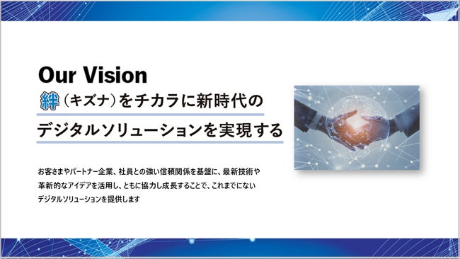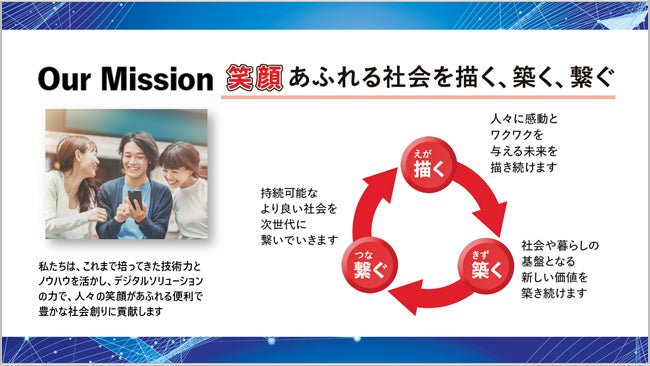 お客さまやパートナー企業、社員との強い信頼関係を基盤に、最新技術や革新的なアイデアを活用し、ともに協力し成長することで、これまでにないデジタルソリューションを提供します。