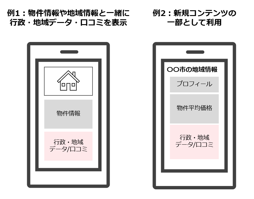 「地域の口コミ提供サービス」は、不動産ポータルサイトの物件詳細ページのような地域ごとのページとともに掲載をする、もしくは新規コンテンツの一部としてお使いいただくことができます。