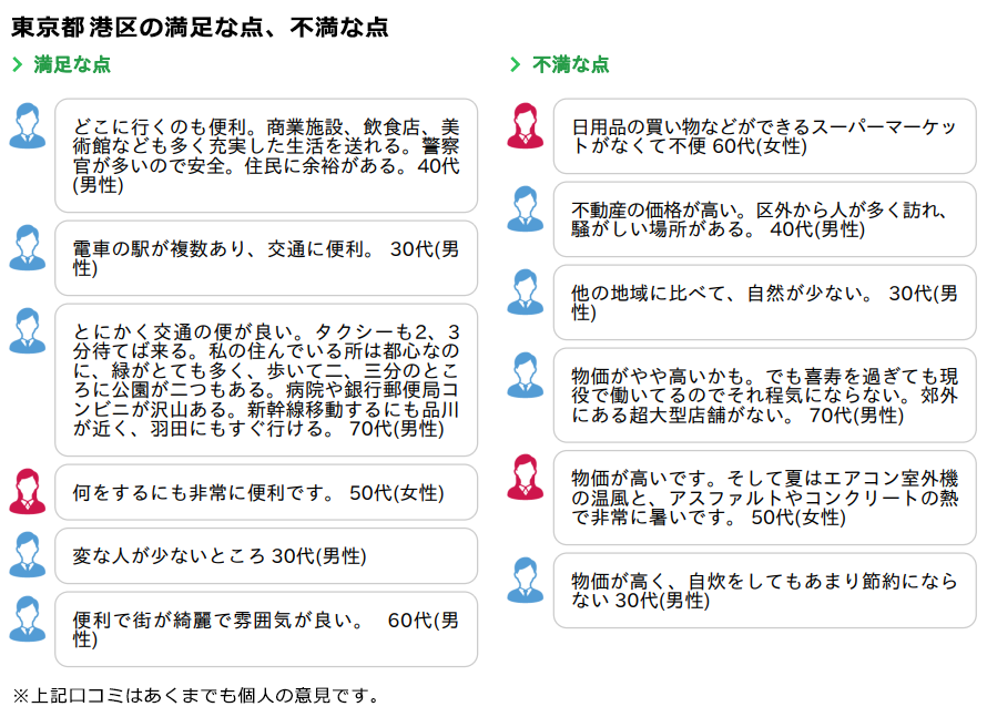 「地域の口コミ提供サービス」は、当社が運営する生活ガイド.comの会員が、自分の住んでいる街の「満足な点」「不満な点」について投稿したものを、全国の市と東京23区ごとにAPI形式でデータを提供するサービスになります。