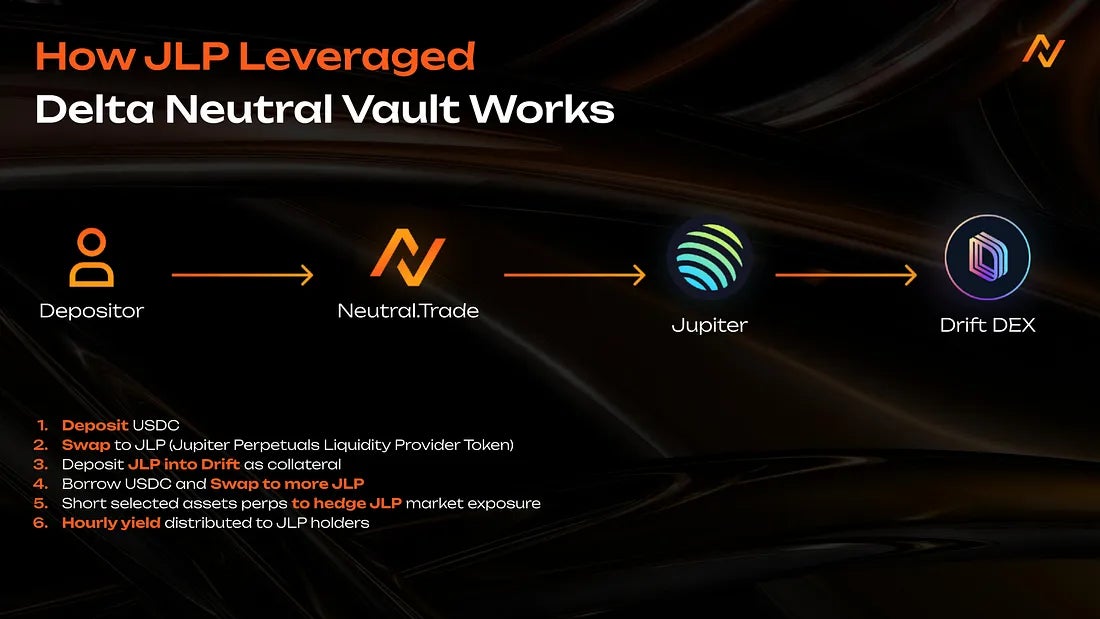 市場中立(デルタ・ニュートラル)戦略 により価格変動リスクを抑えつつ、Jupiter や Drift など主要 DEX から恒常的な取引手数料を獲得 すべてのポジションと履歴をチェーン上でリアルタイム公開する フル・オンチェーン透明性と Proof-of-Yield 預入額と保有期間に応じて将来トークンに交換可能な Neutral Trade Points(NTP)を自動付与するというという仕組みで、従来の CEX 依存型イールドサービスとは一線を画しています。