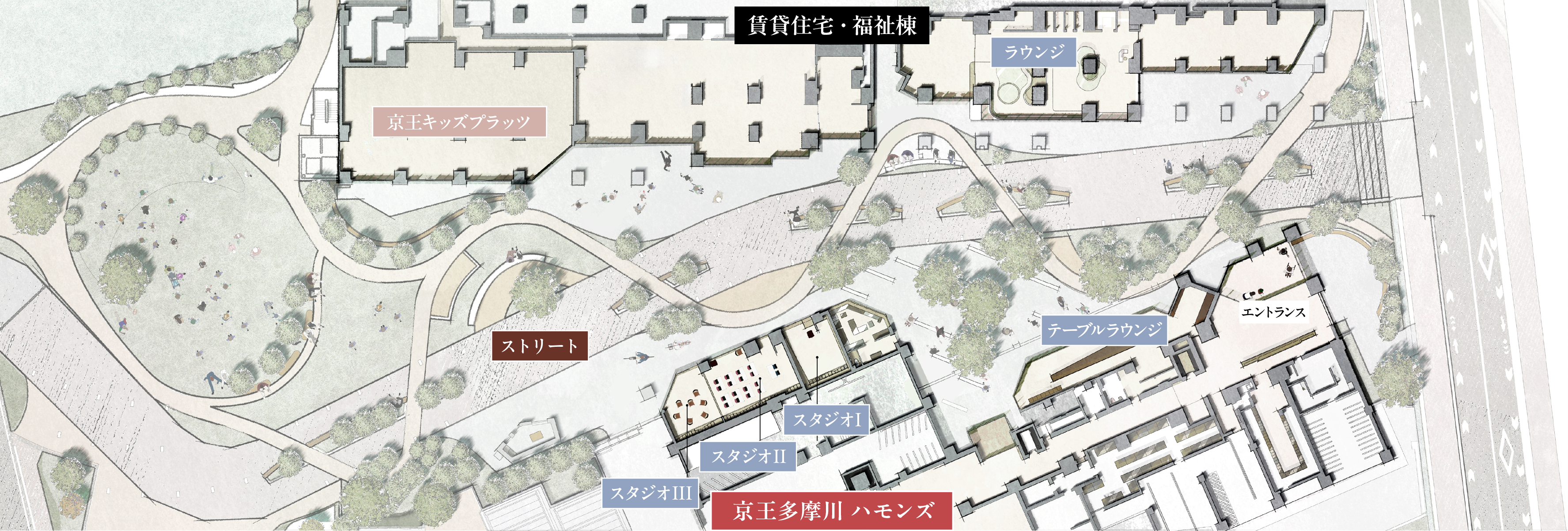 ・「ラウンジ」 :隣接する賃貸住宅・福祉棟の共用施設を京王多摩川ハモンズの入居者も