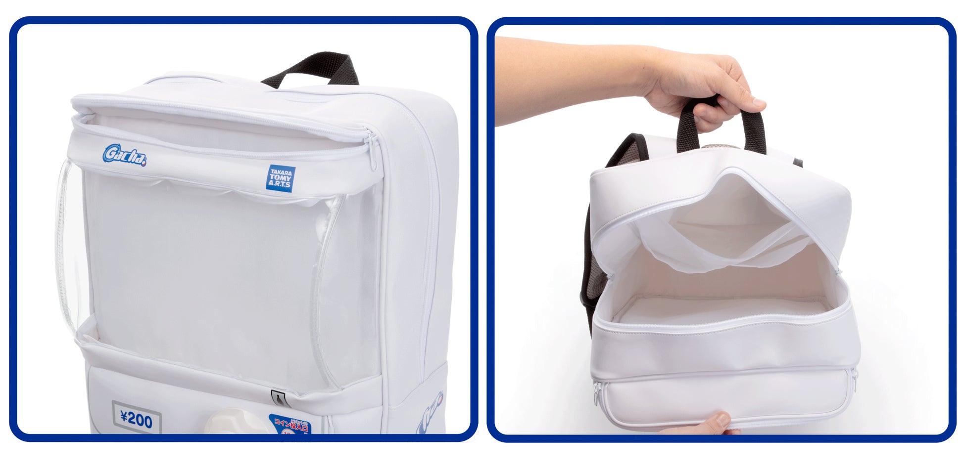 今回発表する第2弾のオフィシャルグッズは、当社のガチャマシン「ガチャ2Ez(イージー)」をモチーフにしたバックパック『しょいガチャ–Showy Gacha–』です。ガチャマシンの形状を各部で再現したバックパックで、本体の透明窓には本物のガチャマシンのようにイラストや写真を飾ったりお気に入りのアイテムを入れたりして、自由にディスプレイすることができます。また、ガチャマシン特有のハンドルを回すギミックを搭載。ガチャマシンと同じカチカチとした感触を楽しみながら、実際に回すことができます。(※カプセルは出てきません)さらに、空のガチャカプセル10個が付属するので、小物入れにしたり好きなアイテムを入れて飾るなど、アイデア次第で様々な楽しみ方ができます。
