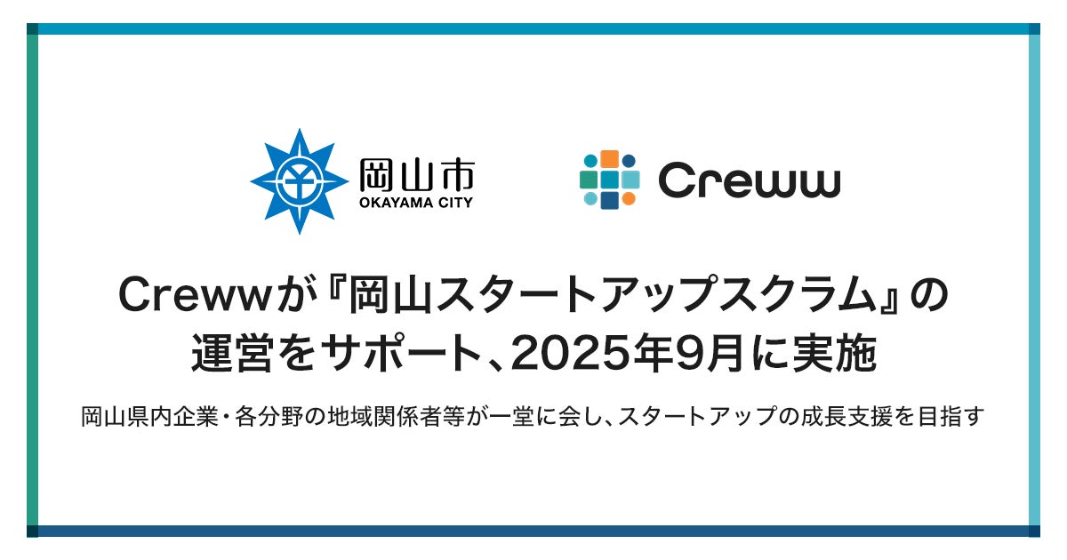 Creww株式会社(代表取締役:伊地知 天、以下「Creww(クルー)」)は、岡山市が、スタートアップの事業成長と認知向上機会の提供、協業のきっかけ創出を目的に主催するシンポジウム『岡山スタートアップスクラム』(以下、本シンポジウム)の運営を行います。本シンポジウムは、2025年9月9日(火)に実施されます。