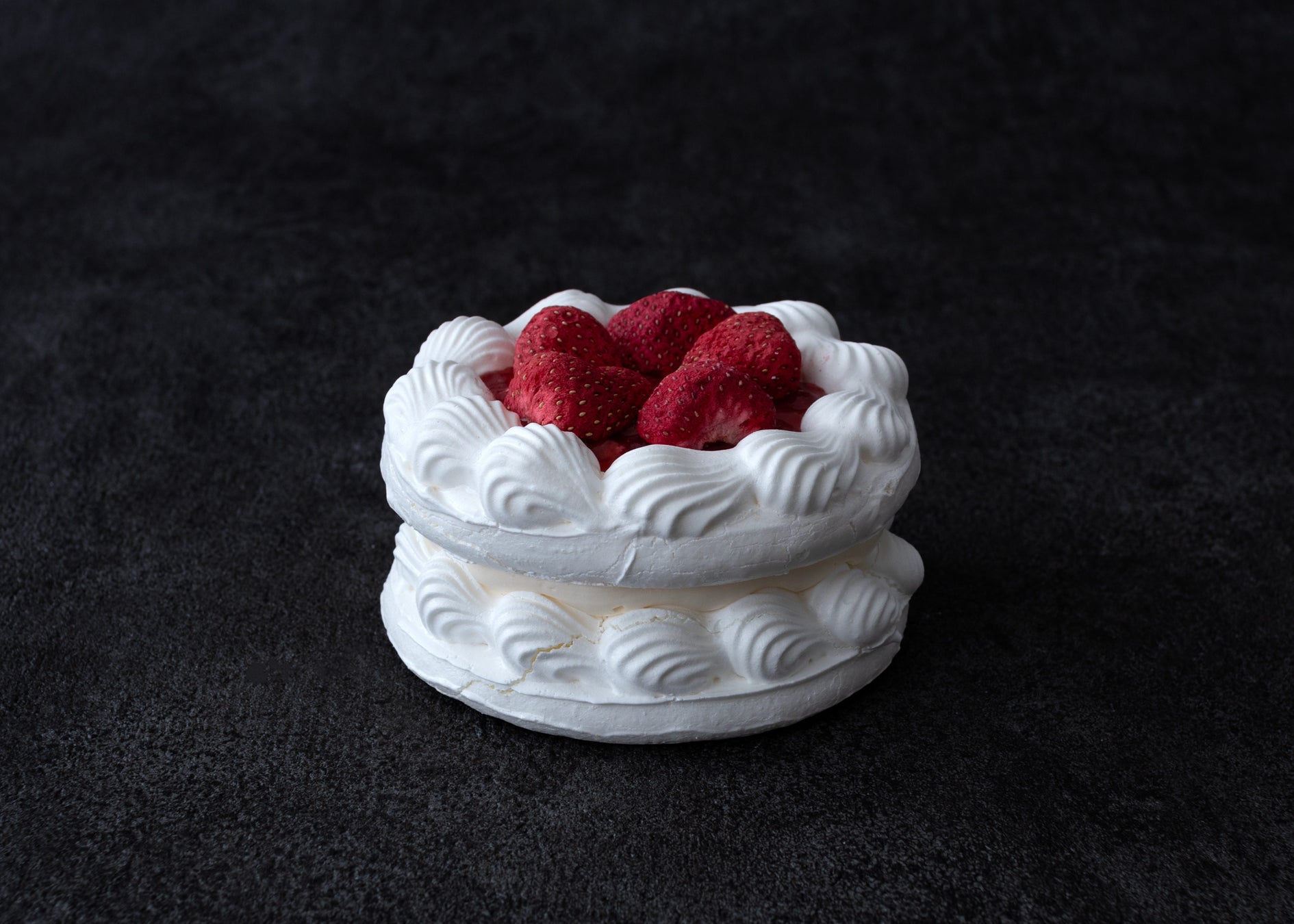 手作りのフレンチメレンゲは、純白のキャンバスのように繊細で軽やか。美しくパイピングされた模様が、アンティークのレースを彷彿とさせます。トップに飾られたフリーズドライいちごの鮮烈な赤が、見る者の目を奪い、テーブルを華やかに彩ります。その中心には、絞りたての塩バターと甘酸っぱいストロベリーソースがたっぷりと詰め込まれ、シンプルでありながら贅沢な味わいを実現しました。